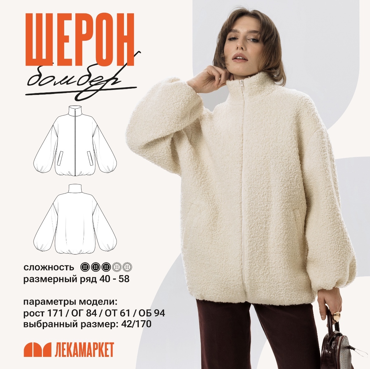Бомбер прямого силуэта, умеренного объема, длиной чуть ниже линии бедер. Линия плеча спущена на 12-14 см. На полочке – прорезные карманы с листочкой. Воротник – стойка, высотой 8 см. Застежка центральная, на тесьму-молния. Рукав втачной, длинный, расширенный к низу. На подгибку низа рукава и бомбера настрочена резинка, что создает эффект «баллона». Бомбер на подкладке.